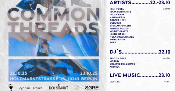 Eine Gruppenausstellung von 13 unabhängigen Künstlerinnen. Zentral ist die Idee der immerwährenden Verbundenheit – zwischen Orten Generationen aber auch zwischen unseren Kunstformen und Identitäten. Common Threads ist eine kollektive Hommage an die jungen Berliner Kreativen. Wir müssen nicht immer am gleichen Strang ziehen sondern dann wenn es darauf ankommt gemeinsam anknüpfen bis etwas Größeres entsteht.