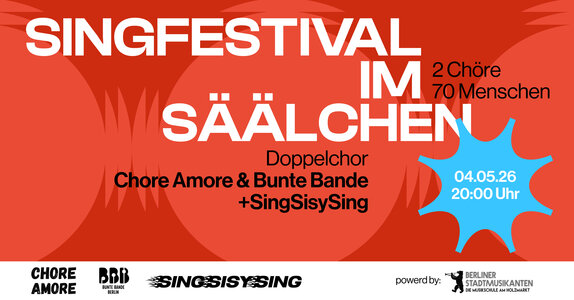 Scientific studies have shown that, in fact, everyone can sing (London, 2016). It’s simply a matter of practice. And that’s exactly what the SINGFESTIVAL IM SÄÄLCHEN, taking place for the first time on May 4, 2026, is all about. The two Berlin choirs CHORE AMOREand BUNTE BANDE BERLIN invite you to a double concert. And the fantastic Berlin sing-along performance duo SingSisySing will also be joining the fun.